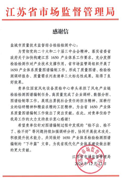 近日,省市场监管局发来感谢信,对盐城市质量技术监督综合检验检测中心(国家风电设备质量检验检测中心)在编制江苏省1650产业体系质量图谱过程中所展现的杰出表现表示衷心感谢,并高度肯定了中心在风电装备产业链检验检测图谱编制任务中所作出的突出贡献。这一认可充分体现了中心在风电装备产业关键领域内所具备的深厚专业实力与强大的技术支撑能力。